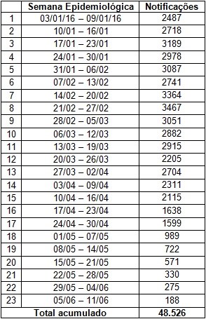 Entre 03 de janeiro e 11 de junho de 2016, foram notificados 48.526 casos de dengue no Espírito Santo. Destes, 563 são suspeitos da forma grave, 19 são óbitos confirmados e 18 são óbitos sob investigação. No mesmo período, a taxa de incidência da doença no Estado ficou em 1.234,79. Essas informações são enviadas à Secretaria de Estado da Saúde até o dia anterior à divulgação do boletim epidemiológico.