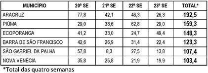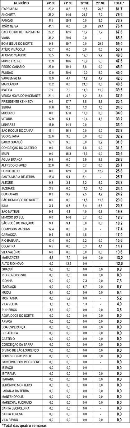 A Secretaria de Estado da Saúde (Sesa) vem registrando queda no número de casos notificados de dengue, e durante três semanas seguidas nenhum município apresenta alta incidência da doença. Do total de incidência acumulada das últimas quatro semanas, 92% das cidades capixabas aparecem com baixa incidência (confira na tabela abaixo). Isso é resultado do trabalho do Gabinete de Monitoramento de Combate ao Aedes aegypti, que avalia e define estratégias de combate ao mosquito, em conjunto com municípios e superintendências regionais de Saúde do Estado, e do apoio da população.