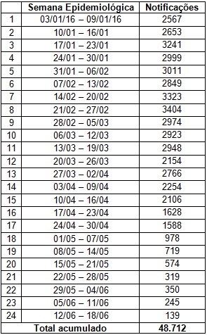 Entre 03 de janeiro e 18 de junho de 2016, foram notificados 48.712 casos de dengue no Espírito Santo. Destes, 563 são suspeitos da forma grave, 19 são óbitos confirmados e 18 são óbitos sob investigação. No mesmo período, a taxa de incidência da doença no Estado ficou em 1.239,52. Essas informações são enviadas à Secretaria de Estado da Saúde até o dia anterior à divulgação do boletim epidemiológico.
