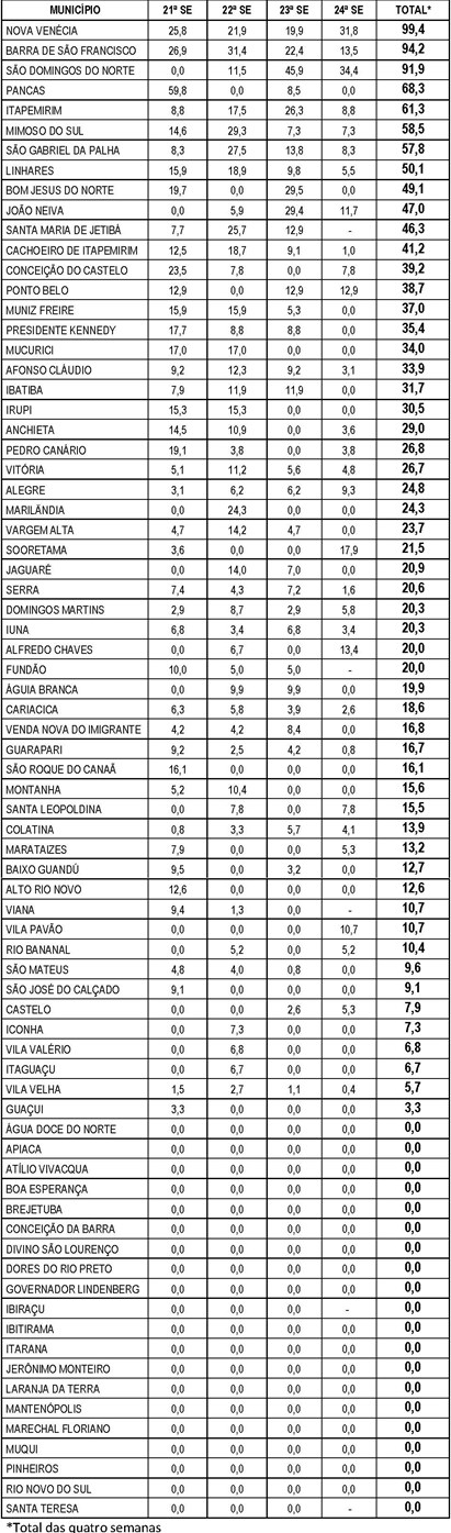 A Secretaria de Estado da Saúde (Sesa) vem registrando queda no número de casos notificados de dengue, e durante quatro semanas seguidas nenhum município apresenta alta incidência da doença. Do total de incidência acumulada das últimas quatro semanas, 96% das cidades capixabas aparecem com baixa incidência (confira na tabela abaixo). Isso é resultado do trabalho do Gabinete de Monitoramento de Combate ao Aedes aegypti, que avalia e define estratégias de combate ao mosquito, em conjunto com municípios e superintendências regionais de Saúde do Estado, e do apoio da população.
