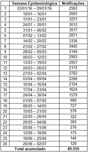Entre 03 de janeiro e 02 de julho de 2016, foram notificados 49.510 casos de dengue no Espírito Santo. Destes, 593 são suspeitos da forma grave, 19 são óbitos confirmados e 25 são óbitos sob investigação. No mesmo período, a taxa de incidência da doença no Estado ficou em 1.259,82. Essas informações são enviadas à Secretaria de Estado da Saúde até o dia anterior à divulgação do boletim epidemiológico.