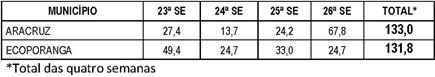 O Boletim Epidemiológico da Dengue é apresentado de duas formas: uma tabela com a indicação das notificações em números absolutos por semana epidemiológica e outra com a incidência de casos de dengue por município.