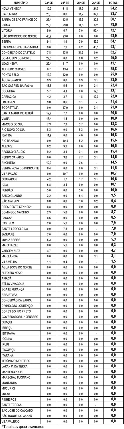 A Secretaria de Estado da Saúde (Sesa) vem registrando queda no número de casos notificados de dengue e, do total acumulado das últimas quatro semanas, 97,43% das cidades capixabas aparecem com baixa incidência (confira na tabela abaixo). Isso é resultado do trabalho do Gabinete de Monitoramento de Combate ao Aedes aegypti, que avalia e define estratégias de combate ao mosquito, em conjunto com municípios e superintendências regionais de Saúde do Estado, e do apoio da população.