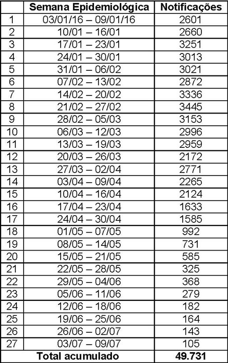 O Boletim Epidemiológico da Dengue é apresentado de duas formas: uma tabela com a indicação das notificações em números absolutos por semana epidemiológica e outra com a incidência de casos de dengue por município.