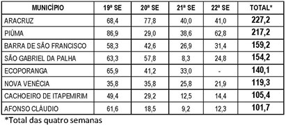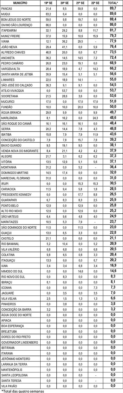 A Secretaria de Estado da Saúde (Sesa) vem registrando queda no número de casos notificados de dengue e, desde a última semana, nenhum município apresenta alta incidência da doença. Do total de incidência acumulada das últimas quatro semanas, 89,74% das cidades capixabas aparecem com baixa incidência (confira na tabela abaixo). Isso é resultado do trabalho do Gabinete de Monitoramento de Combate ao Aedes aegypti que avalia e define estratégias de combate ao mosquito, em conjunto com municípios e superintendências regionais de Saúde do Estado, e do apoio da população.
