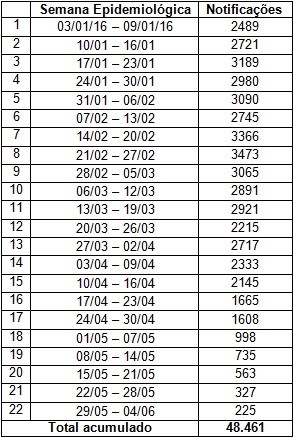 Entre 03 de janeiro e 04 de junho de 2016, foram notificados 48.461 casos de dengue no Espírito Santo. Destes, 559 são suspeitos da forma grave, 19 são óbitos confirmados e 16 são óbitos sob investigação. No mesmo período, a taxa de incidência da doença no Estado ficou em 1.233,13. Essas informações são enviadas à Secretaria de Estado da Saúde até o dia anterior à divulgação do boletim epidemiológico.