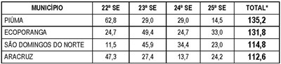 A Secretaria de Estado da Saúde (Sesa) vem registrando queda no número de casos notificados de dengue, e durante cinco semanas seguidas nenhum município apresenta alta incidência da doença. Do total de incidência acumulada das últimas quatro semanas, 94,87% das cidades capixabas aparecem com baixa incidência (confira na tabela abaixo). Isso é resultado do trabalho do Gabinete de Monitoramento de Combate ao Aedes aegypti, que avalia e define estratégias de combate ao mosquito, em conjunto com municípios e superintendências regionais de Saúde do Estado, e do apoio da população.