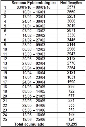 Entre 03 de janeiro e 25 de junho de 2016, foram notificados 49.295 casos de dengue no Espírito Santo. Destes, 567 são suspeitos da forma grave, 19 são óbitos confirmados e 20 são óbitos sob investigação. No mesmo período, a taxa de incidência da doença no Estado ficou em 1.254,35. Essas informações são enviadas à Secretaria de Estado da Saúde até o dia anterior à divulgação do boletim epidemiológico.