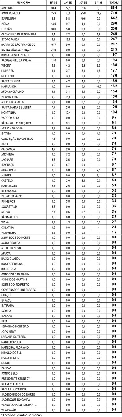 A Secretaria de Saúde do Espírito Santo (Sesa) vem registrando baixa incidência de dengue em todos os municípios nas últimas semanas epidemiológicas. Esse resultado é fruto tanto do trabalho do Gabinete de Monitoramento de Combate ao Aedes aegypti, que avalia e define estratégias de combate ao vetor da dengue, em conjunto com municípios e superintendências regionais de Saúde do Estado, quanto do apoio da população na eliminação dos focos do mosquito.