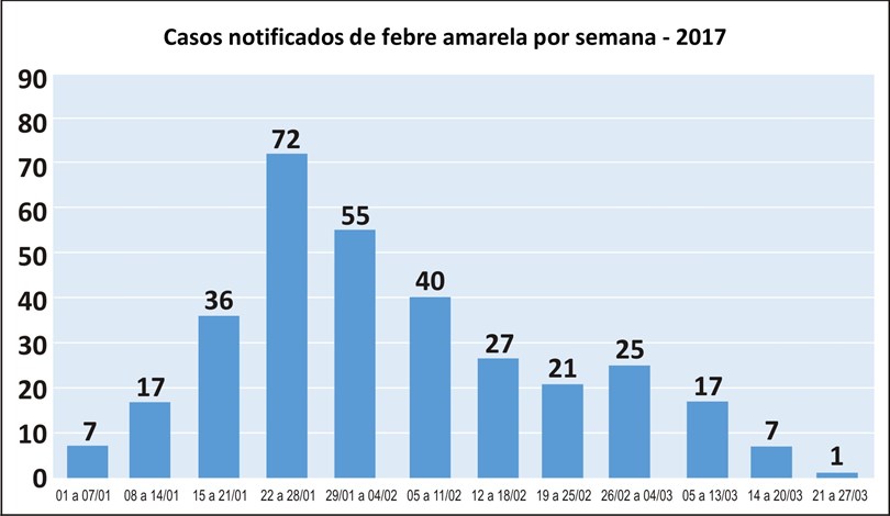 Este ano, até terça-feira (21), a Sesa recebeu 328 notificações de suspeita de febre amarela. Sessenta e sete notificações foram descartadas. Do total de 261 casos, 109 foram confirmados para febre amarela silvestre, sendo que 32 casos evoluíram para óbito – Muniz Freire (05), Brejetuba (04), Colatina (03), Irupi (03), Ibatiba (02), Itarana (02), Laranja da Terra (02), Pancas (02), Afonso Cláudio (02), Conceição do Castelo (02), São Roque do Canaã (01), Domingos Martins (01), Santa Maria de Jetibá (01), Vargem Alta (01) e Aracruz (01).