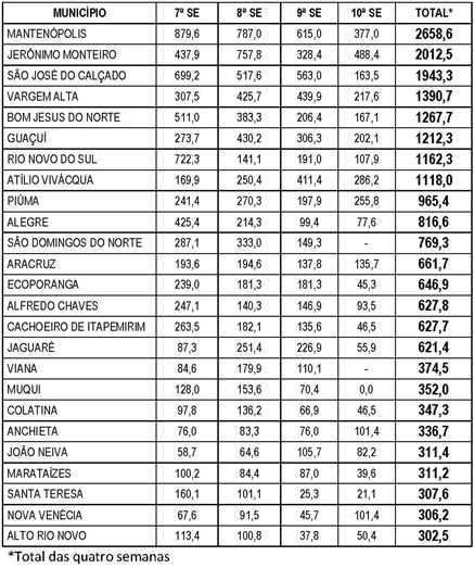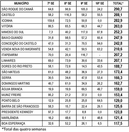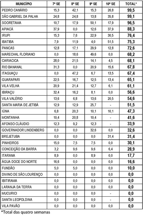 O Boletim Epidemiológico da Dengue é apresentado de duas formas: uma tabela com a indicação das notificações em números absolutos por semana epidemiológica e outra com a incidência de casos de dengue por município.