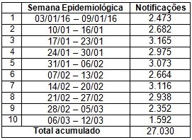Foram notificados 27.030 casos de dengue entre 03 de janeiro e 12 de março de 2016 no Espírito Santo. Destes, 308 são suspeitos da forma grave, 07 são óbitos confirmados e 17 são óbitos sob investigação. No mesmo período, a taxa de incidência da doença no Estado ficou em 687,80. Essas informações são enviadas à Secretaria de Estado da Saúde até o dia anterior à divulgação do boletim epidemiológico.