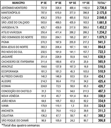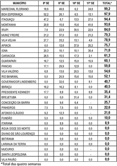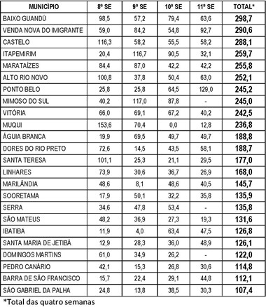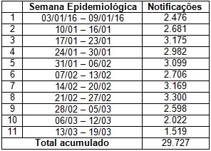 O Boletim Epidemiológico da Dengue é apresentado de duas formas: uma tabela com a indicação das notificações em números absolutos por semana epidemiológica e outra com a incidência de casos de dengue por município.