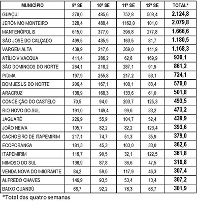 O Boletim Epidemiológico da Dengue é apresentado de duas formas: uma tabela com a indicação das notificações em números absolutos por semana epidemiológica e outra com a incidência de casos de dengue por município.