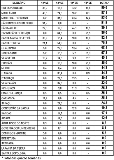 O Boletim Epidemiológico da Dengue é apresentado de duas formas: uma tabela com a indicação das notificações em números absolutos por semana epidemiológica e outra com a incidência de casos de dengue por município.