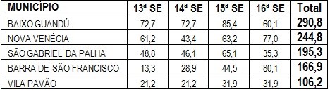 | SÃO ROQUE DO CANAÃ | 8,0 | 0,0 | 0,0 | 0,0 | 8,0 |