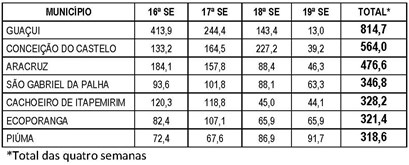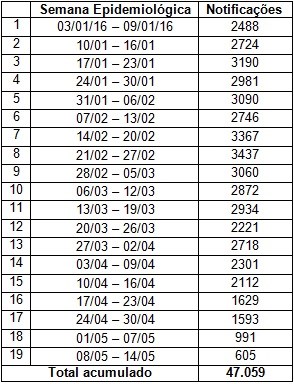 Foram notificados 47.059 casos de dengue entre 03 de janeiro e 14 de maio de 2016 no Espírito Santo. Destes, 506 são suspeitos da forma grave, 19 são óbitos confirmados e 14 são óbitos sob investigação. No mesmo período, a taxa de incidência da doença no Estado ficou em 1.197,46. Essas informações são enviadas à Secretaria de Estado da Saúde até o dia anterior à divulgação do boletim epidemiológico.