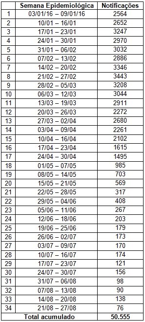 O Boletim Epidemiológico da Dengue é apresentado de duas formas: uma tabela com a indicação das notificações em números absolutos por semana epidemiológica e outra com a incidência de casos de dengue por município.