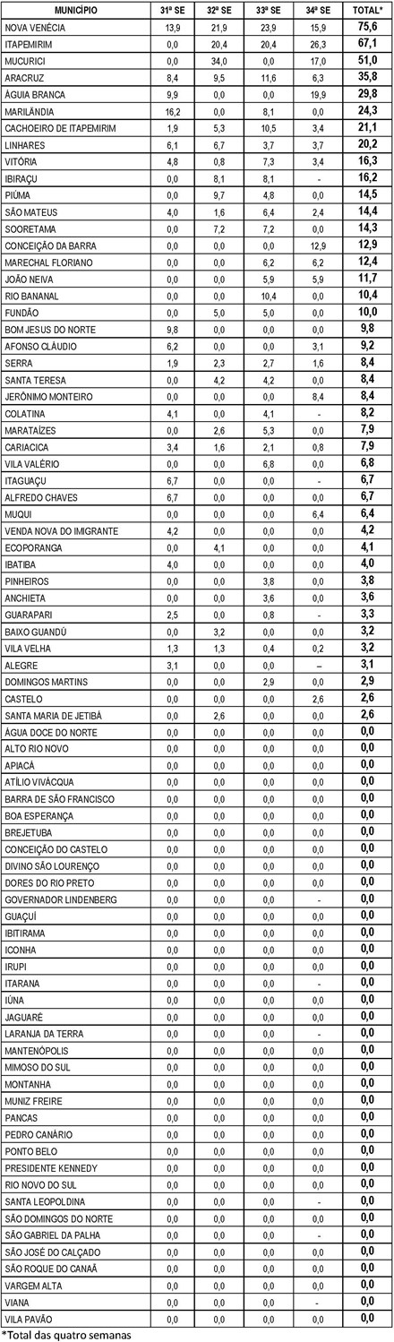 A Secretaria de Saúde do Espírito Santo (Sesa) vem registrando baixa incidência de dengue em todos os municípios nas últimas semanas epidemiológicas. Esse resultado é fruto tanto do trabalho do Gabinete de Monitoramento de Combate ao Aedes aegypti, que avalia e define estratégias de combate ao vetor da dengue, em conjunto com municípios e superintendências regionais de Saúde do Estado, quanto do apoio da população na eliminação dos focos do mosquito.