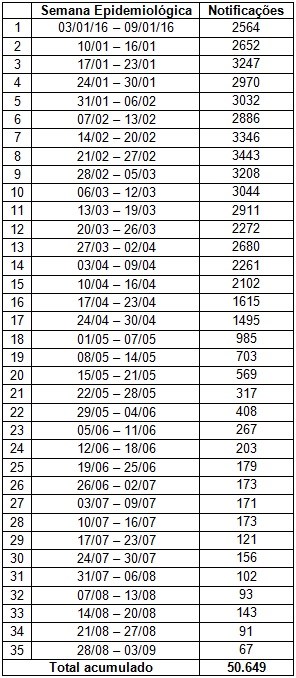 Entre 03 de janeiro e 03 de setembro de 2016, foram notificados 50.649 casos de dengue no Espírito Santo. Destes, 639 são suspeitos da forma grave, 22 são óbitos confirmados e 17 são óbitos sob investigação. No mesmo período, a taxa de incidência da doença no Estado ficou em 1.288,81. Essas informações são enviadas à Secretaria de Estado da Saúde até o dia anterior à divulgação do boletim epidemiológico.