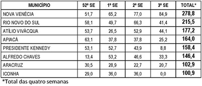 O Boletim Epidemiológico da Dengue é apresentado de duas formas: uma tabela com a indicação das notificações em números absolutos por semana epidemiológica e outra com a incidência de casos de dengue por município.