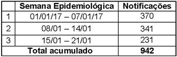 Foram notificados 942 casos de dengue, entre 1º e 21 de janeiro de 2017, no Espírito Santo. Destes, 11 são casos graves e 02 são óbitos sob investigação. No mesmo período, a taxa de incidência da doença no Estado ficou em 23,71. Essas informações são enviadas à Secretaria de Estado da Saúde até o dia anterior à divulgação do boletim epidemiológico.