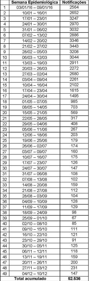 Foram notificados 52.536 casos de dengue, entre 03 de janeiro e 10 de dezembro de 2016, no Espírito Santo. Destes, 712 são suspeitos da forma grave, 22 são óbitos confirmados e 17 são óbitos sob investigação. No mesmo período, a taxa de incidência da doença no Estado ficou em 1.336,82. Essas informações são enviadas à Secretaria de Estado da Saúde até o dia anterior à divulgação do boletim epidemiológico.