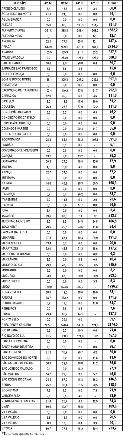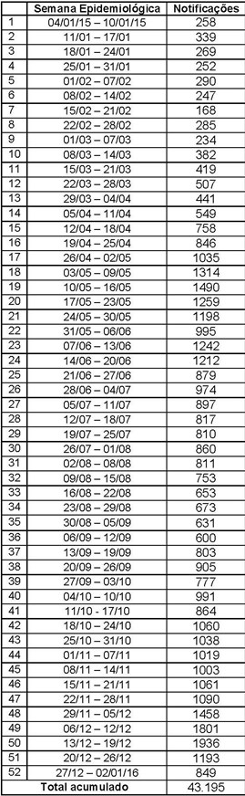 Foram notificados 43.195 casos de dengue entre 04 de janeiro de 2015 e 02 de janeiro de 2016 no Espírito Santo. Destes, 947 são suspeitos da forma grave, 30 são óbitos confirmados e 13 são óbitos sob investigação. No mesmo período, a taxa de incidência da doença no Estado ficou em 1.111,83.Essas informações são enviadas à Secretaria de Estado da Saúde até o dia anterior à divulgação do boletim epidemiológico.