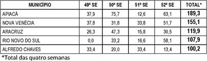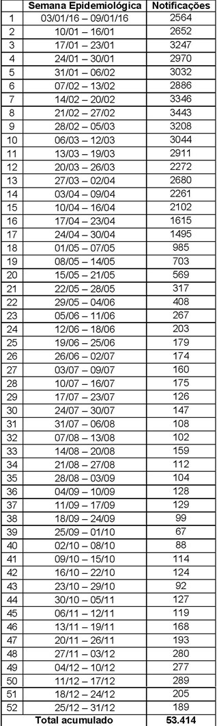 Foram notificados 53.414 casos de dengue, entre 03 de janeiro e 31 de dezembro de 2016, no Espírito Santo. Destes, 724 são suspeitos da forma grave, 22 são óbitos confirmados e 19 são óbitos sob investigação. No mesmo período, a taxa de incidência da doença no Estado ficou em 1.359,17. Essas informações são enviadas à Secretaria de Estado da Saúde até o dia anterior à divulgação do boletim epidemiológico.