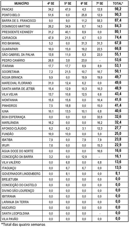 O Boletim Epidemiológico da Dengue é apresentado de duas formas: uma tabela com a indicação das notificações em números absolutos por semana epidemiológica e outra com a incidência de casos de dengue por município.