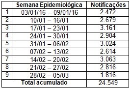 Foram notificados 24.549 casos de dengue entre 03 de janeiro e 05 de março de 2016 no Espírito Santo. Destes, 278 são suspeitos da forma grave, 04 são óbitos confirmados e 20 são óbitos sob investigação. No mesmo período, a taxa de incidência da doença no Estado ficou em 624,67. Essas informações são enviadas à Secretaria de Estado da Saúde até o dia anterior à divulgação do boletim epidemiológico.