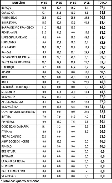 O Boletim Epidemiológico da Dengue é apresentado de duas formas: uma tabela com a indicação das notificações em números absolutos por semana epidemiológica e outra com a incidência de casos de dengue por município.