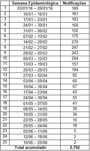 Tabela com o número de casos de zika por semana epidemiológica 2016