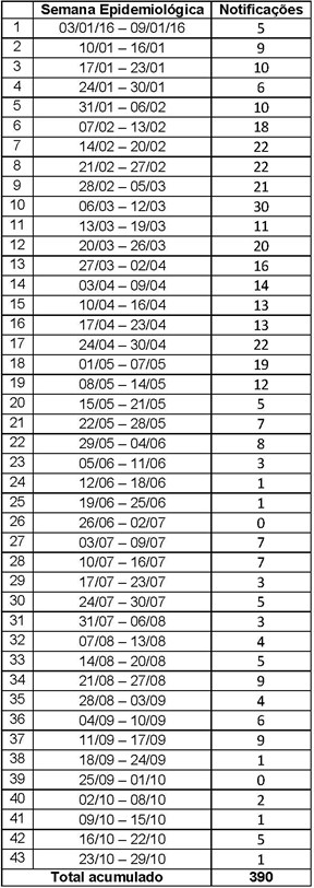 Tabela com o número de notificações de Chikungunya por semana epidemiológica 2016
