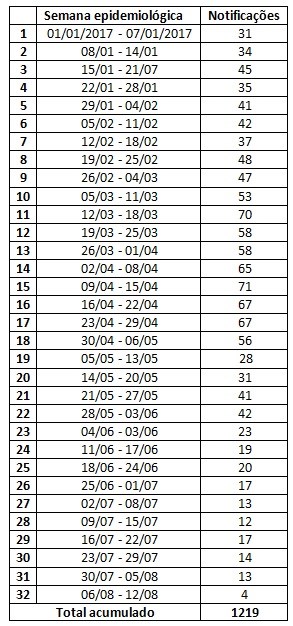 A Secretaria de Estado da Saúde (Sesa) informa que foram notificados no Espírito Santo 1.219 casos de Chikungunya entre 1º de janeiro de 2017 e o último sábado (12). Dentro desse total, há 01 óbito confirmado. Há registro de circulação do vírus em 20 municípios: Afonso Cláudio, Alfredo Chaves, Aracruz, Baixo Guandu, Cachoeiro de Itapemirim, Cariacica, Colatina, Conceição da Barra, Guaçuí, Guarapari, Jerônimo Monteiro, Linhares, Marechal Floriano, Montanha, Nova Venécia, São Mateus, Serra, Vargem Alta, Vila Velha e Vitória.