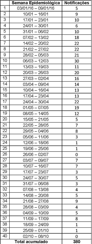 A Secretaria de Estado da Saúde (Sesa) informa que foram notificados no Espírito Santo 380 casos de Chikungunya, entre 03 de janeiro e 08 de outubro de 2016. Há registro de circulação do vírus em dez municípios: Aracruz, Afonso Cláudio, Cariacica, Cachoeiro de Itapemirim, Guarapari, Guaçuí, Montanha, Vila Velha, Vitória e Serra.