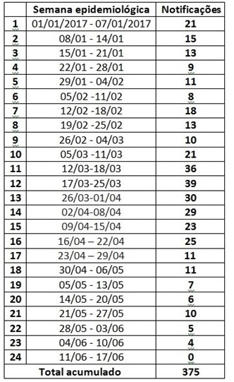 Tabela com o número de casos de zika por semana epidemiológica 2017
