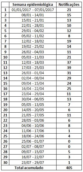 Tabela com o número de casos de zika por semana epidemiológica 2017