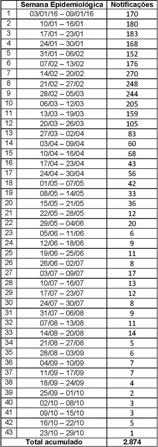 Tabela com o número de casos de zika por semana epidemiológica 2016