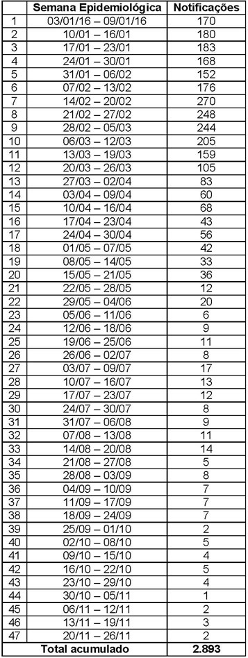Tabela com o número de casos de zika por semana epidemiológica 2016