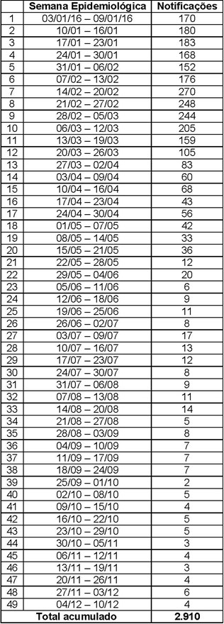Tabela com o número de casos de zika por semana epidemiológica 2016