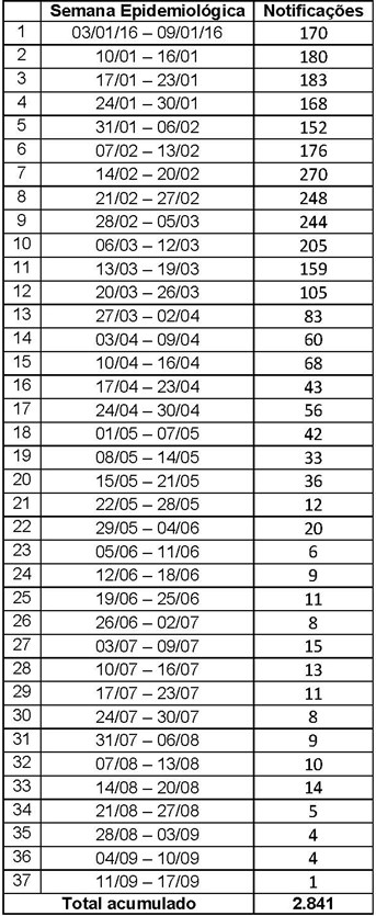 Tabela com o número de casos de zika por semana epidemiológica 2016